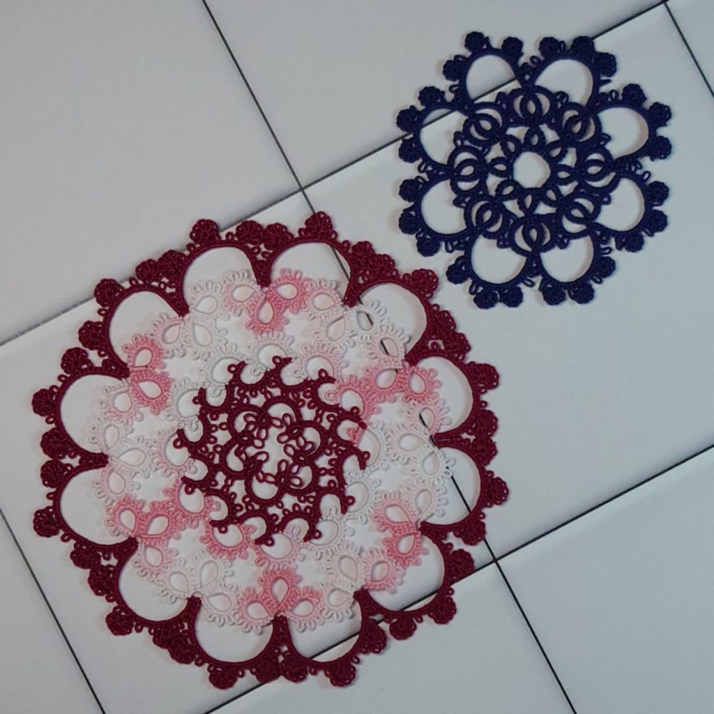 という感じにしてみました!数字は目数です。Pはピコット。Jはジョセフィンノット。ジョセフィンノットの数を減らすので、ジョセフィンノットの間のピコット数を変更してみました。結果がこちら👇赤いのが今回つくったミニドイリーですが、わちゃわちゃはちょっと減っている気はするのですが、思ったよりもスッキリさがない🙄