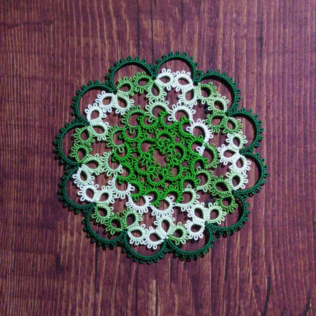 とりあえず、新しく使ってみたい緑色のボカシの感じを知りたかったので、ジョセフィンノットつけないパターンのミニドイリーに逃げてしまいました…あと、ジョセフィンノットだとまぁレース糸の消費も多くなるし…いま緑のレース糸は四葉のモチーフで使いまくってるからあまり消費したくなくて。